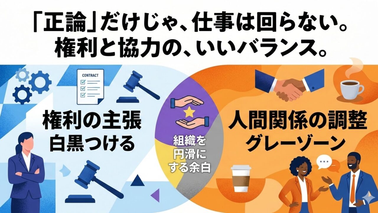 権利を「当然の権利」として振りかざすのではなく、あえて少し引いてみる。あえてグレーな部分を残しておく。この「あそび」があるからこそ、いざという時の提案が通りやすくなり、結果として自分自身の働きやすさに繋がります。